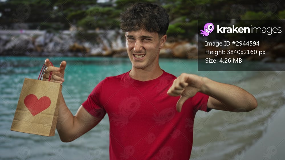 Man holding paper bag with red heart emblem and pointing finger at it at street near shore rocks and water; rejection romance.