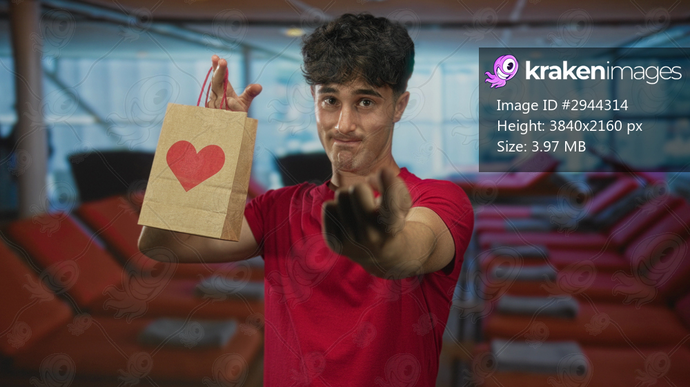 Man holding paper bag with red heart points finger at cruise lounge while winking; playful flirtation.