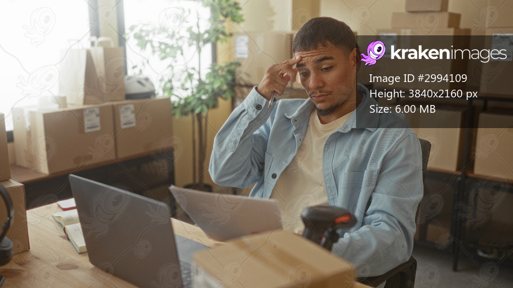 Man holding paperwork and pen while seated at laptop among shipping boxes in small business building; thoughtful.