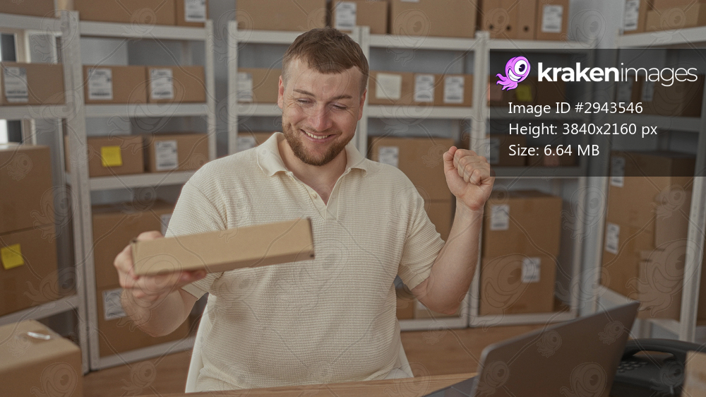 Man holding parcel and pumping fist at desk in building with shelving of packed boxes behind him; small business success happiness.