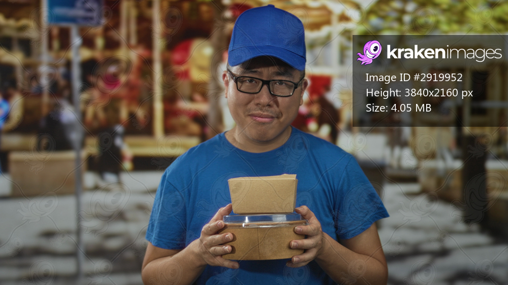 Man holding parcel and takeaway food boxes on street near carnival carousel, wearing blue cap and t shirt and glasses; service dedication.