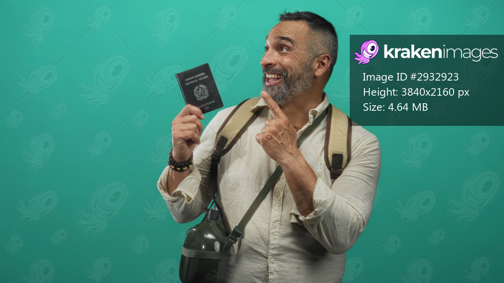 Man holding passport and backpack while pointing finger and smiling in studio with teal background; adventure.