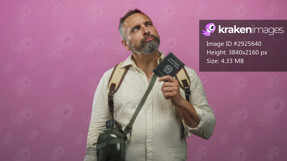 Man holding passport and canteen strap with backpack visible in pink studio, looking upward with passport near his face; thoughtful travel reflection wanderlust. - Kraken Images