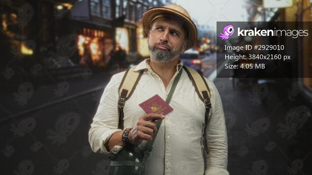 Man holding passport and finger pointing to passport on street, wearing hat and backpack with bracelets and satchel; travel uncertainty.