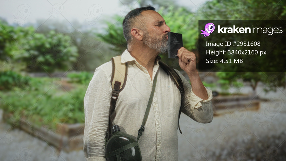 Man holding passport in forest with backpack and canteen, shirt sleeves rolled and looking aside; adventure travel.