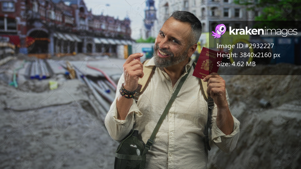 Man holding passport and pinching thumb and forefinger while smiling and presenting passport in building construction site with backpack and canteen; adventurous travel. - Kraken Images
