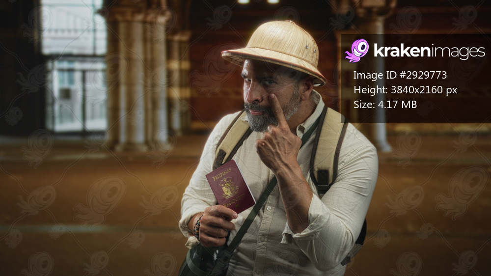 Man holding passport and pointing finger while standing in a historic building hall with backpack and pith helmet; confidence travel exploration.