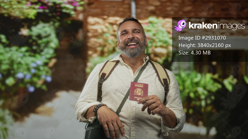 Man holding passport and smiling with hand raised beside backpack at building entrance of a sunlit building outdoors; travel joy.