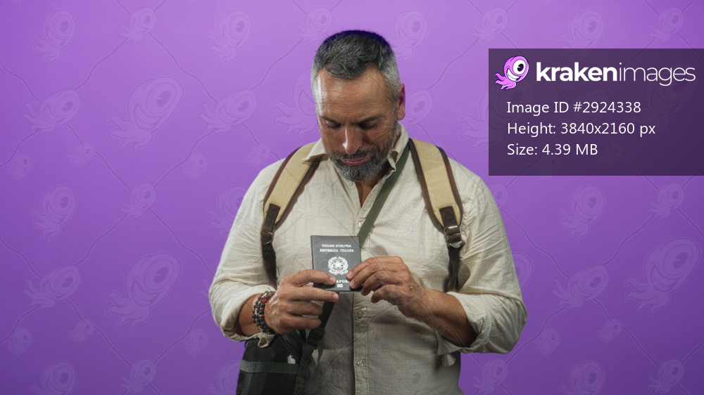Man holding passport, wearing beige backpack and canvas shoulder bag in purple studio; quiet contemplation.