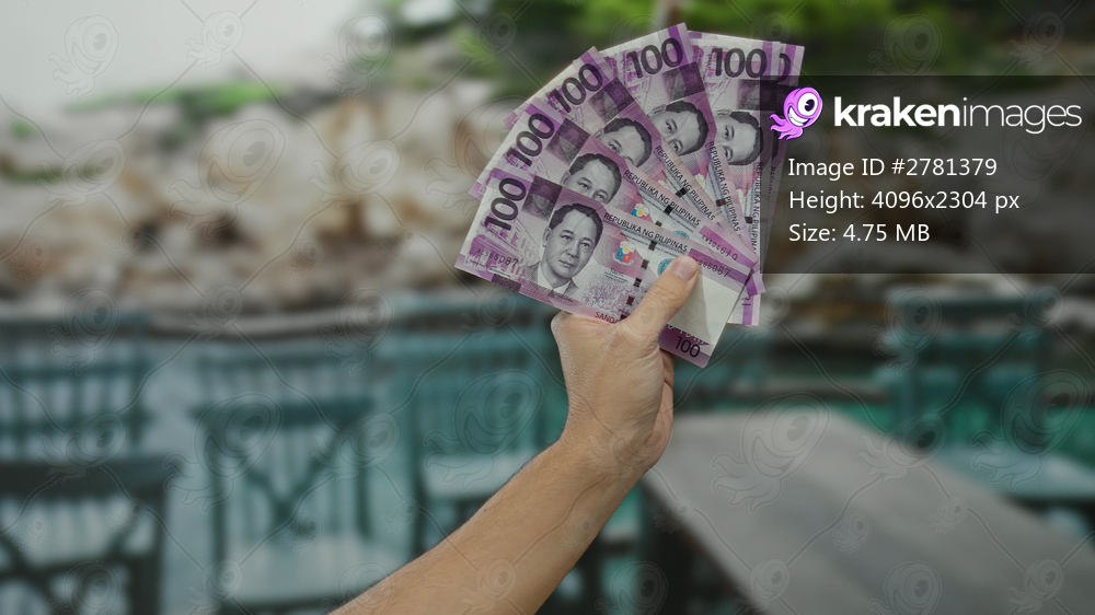 Man holding philippine pesos against beach backdrop with clear sky, showcasing money in a seaside setting.