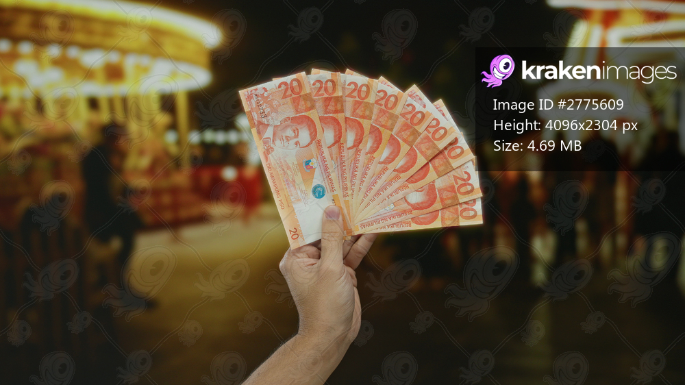 Man holding philippine pesos in hand, set against the lively backdrop of a vibrant outdoor carnival, showcasing the dynamic atmosphere of fun and commerce under colorful lights. - Kraken Images