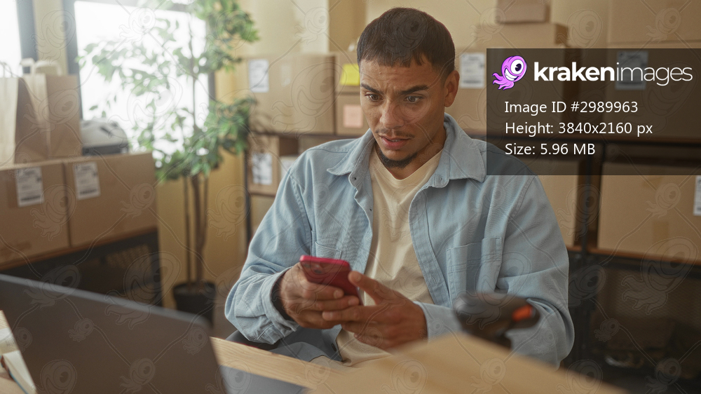 Man holding phone and frowning amid stacked shipping boxes at desk in building with laptop and packing supplies; shipping concern.
