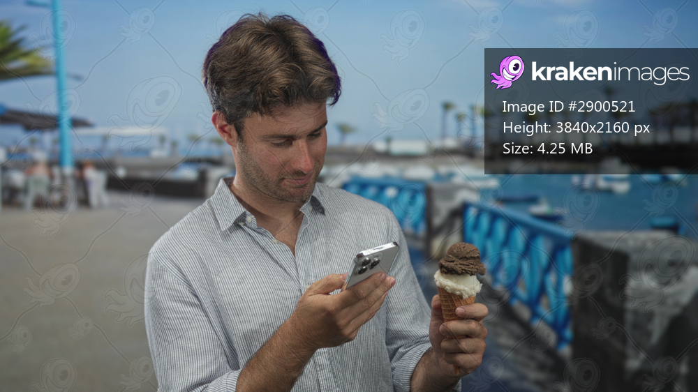 Man holding phone and ice cream cone while looking at the screen on street by a pier with boats and palm trees; relaxation summer contentment.