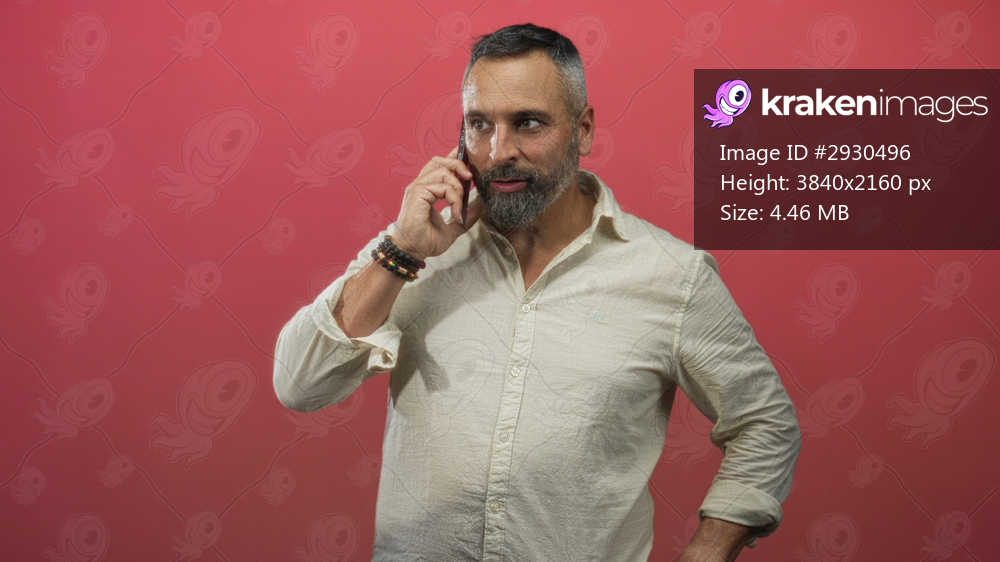Man holding phone to ear, bearded middle aged hispanic wearing beige shirt and one hand on hip in pink studio; happy conversation.