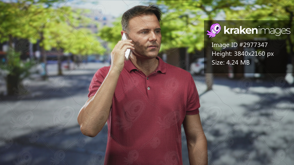 Man holding phone to ear with his right hand on a sunlit street lined with trees and parked cars, wearing red polo; concern urgency.