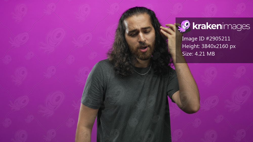 Man holding phone to ear in magenta studio backdrop, young bearded man with long dark hair wearing a gray t shirt and raised hand holding smartphone; frustration connectivity issue. - Kraken Images