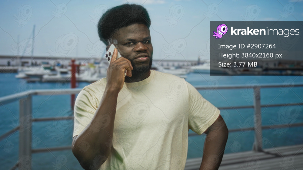 Man holding phone to ear on building pier by boats, hand visible and listening with slight frown, standing near railing; concern communication.