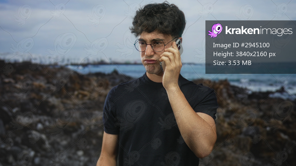 Man holding phone to ear on rocky seaside beach wearing glasses with bare forearm visible and dark t shirt; concern uncertainty.