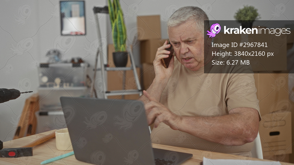 Man holding phone to ear and pointing at laptop amid packed moving boxes, ladder and tools in a cluttered building; moving concern.