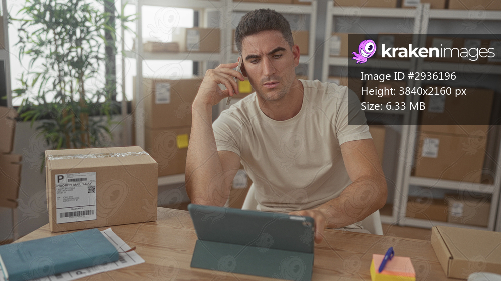 Man holding phone to ear and tapping tablet while sorting cardboard parcels on a wooden table in building; concern focus.