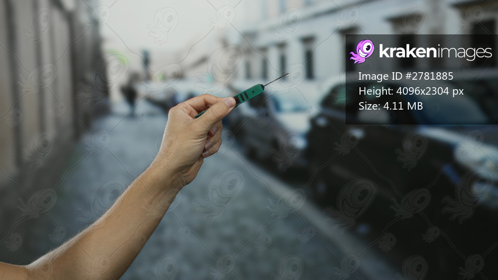 Man holding picklock on city street with blurred cars and buildings in the background, showcasing urban environment and locksmith tool in male hand.