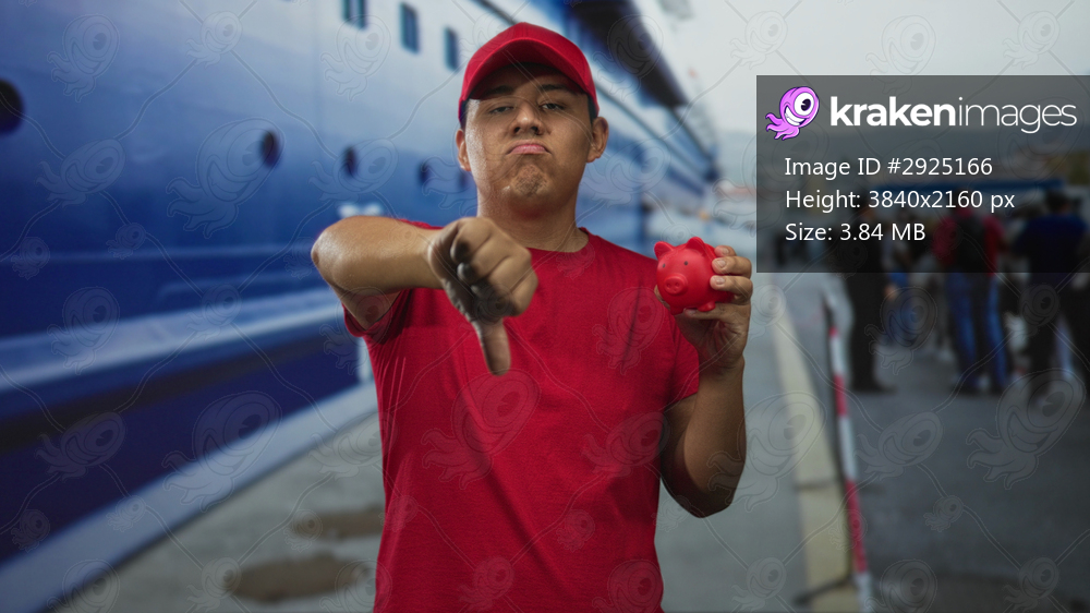 Man holding piggy bank and showing thumbs down on a street pier by a ship; frustration money loss savings.