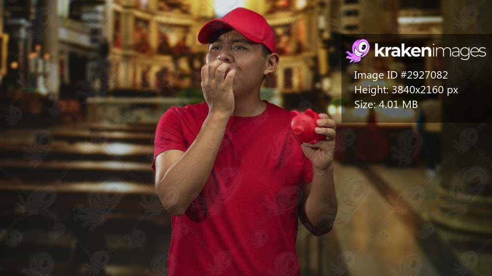 Man holding piggybank and touching chin in church building while wearing red cap and red shirt; financial concern.