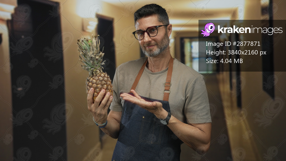 Man holding pineapple and gesturing with open hand in hotel building hallway, wearing apron and glasses; curiosity experiment.