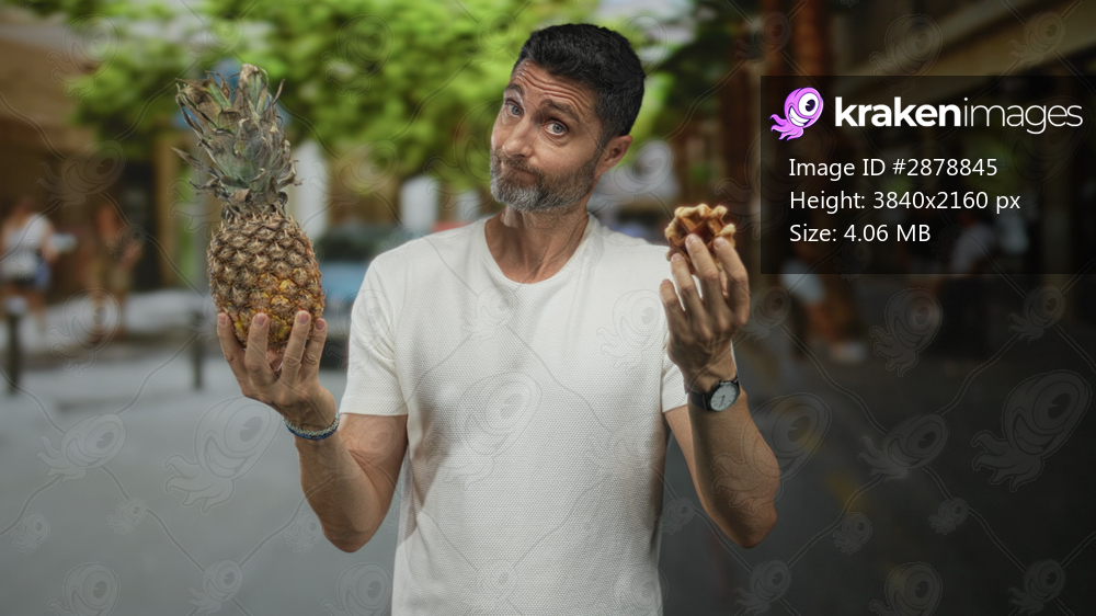 Man holding pineapple and waffle with bare hands while shrugging and weighing the items on a busy street; indecision choice.