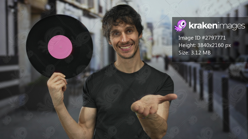 Man holding pink label vinyl record with open palm presentation gesture on city street scene, smiling at disc; nostalgia.