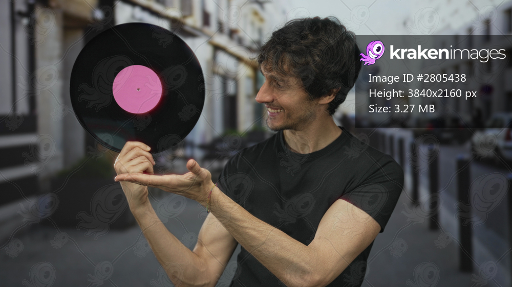 Man holding pink label vinyl record with open palm presentation gesture on city street scene, smiling at disc; nostalgia.