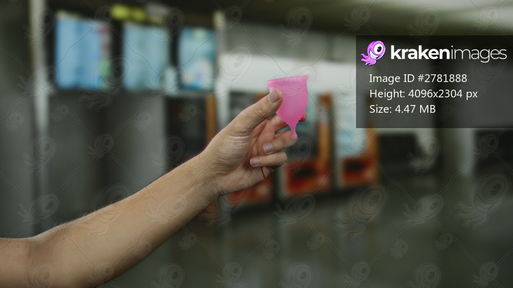 Man holding pink menstrual cup indoors at airport terminal with blurred vending machines and information screens in the background.