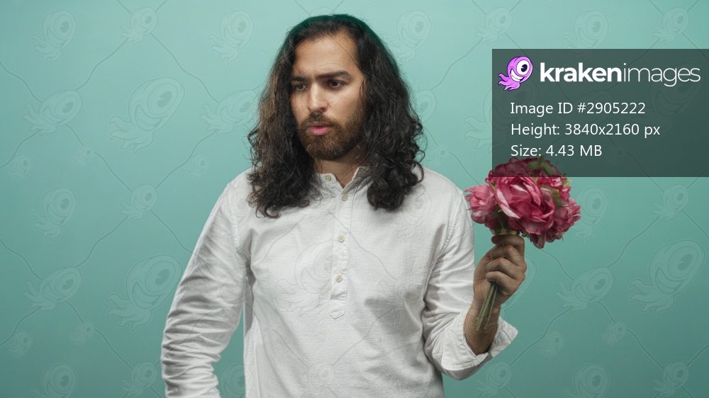 Man holding pink peony bouquet in studio with teal backdrop and neutral expression; quiet contemplation.