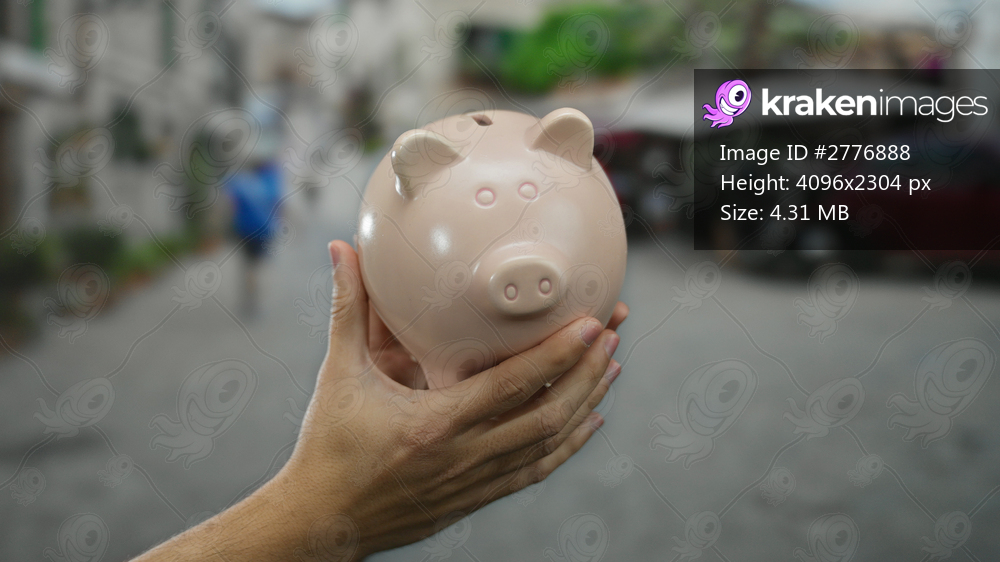 Man holding pink piggy bank on a busy city street symbolizing savings and finance outdoors.