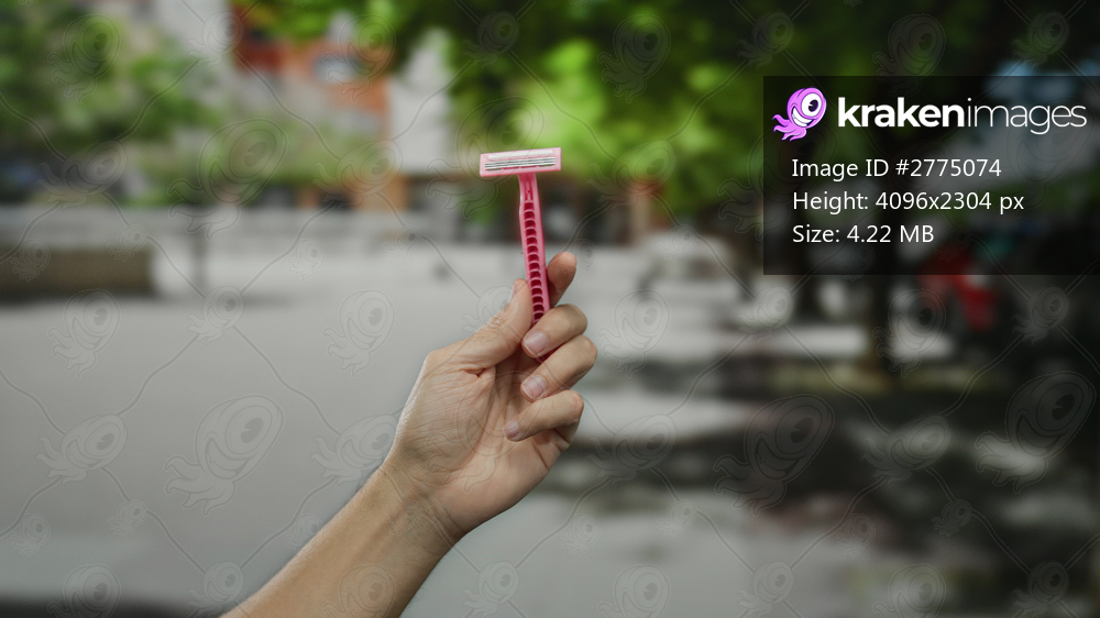 Man holding pink razor in city street with trees and buildings in the blurred background displaying an urban outdoor setting during daytime.