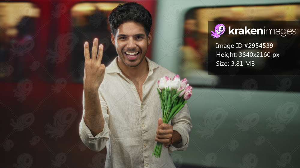 Man holding pink tulip bouquet holds up two fingers on a subway platform inside a building; romance playful greeting.