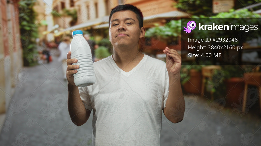 Man holding plastic bottle on street near an outdoor restaurant terrace, right hand making ok sign; satisfaction refreshment.