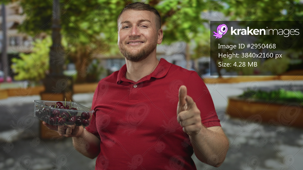 Man holding plastic container of cherries points finger at camera and shows thumbs up on street; friendly invitation.