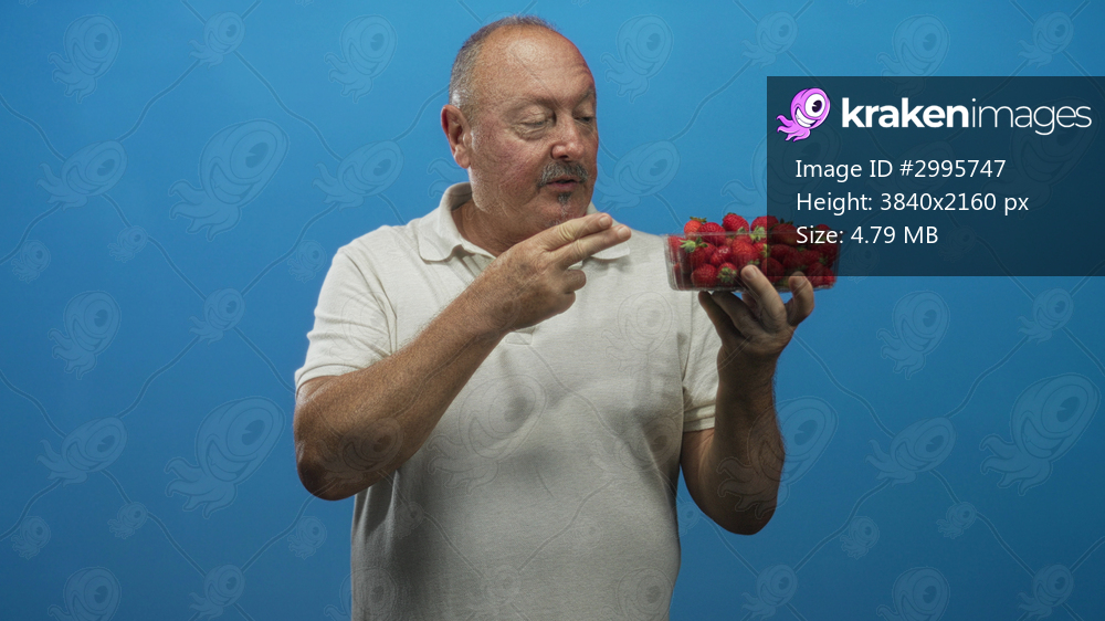 Man holding plastic container of strawberries and pointing finger to strawberries while presenting the fruit to camera in studio; curiosity.