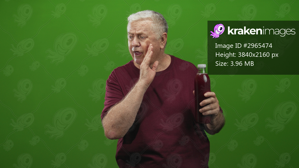 Man holding pomegranate juice bottle, hand to cheek gesture in studio; contemplation health wellness.