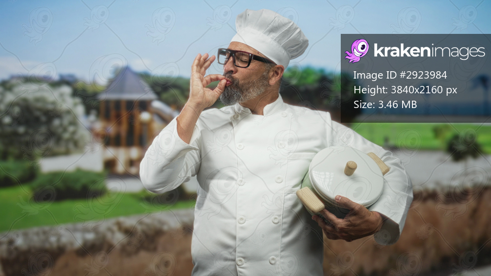 Man holding pot and making ok gesture in park with green lawn and trees visible smiling; culinary pride.