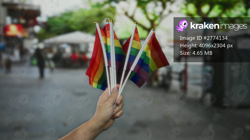 Man holding rainbow flags on a city street, showcasing lgbtq pride with vibrant colors and diverse unity outdoors.