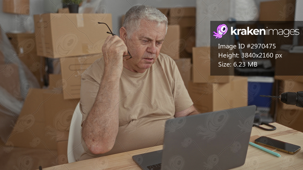 Man holding reading glasses near face while studying laptop at a cluttered table surrounded by packed moving boxes in a building; frustration.