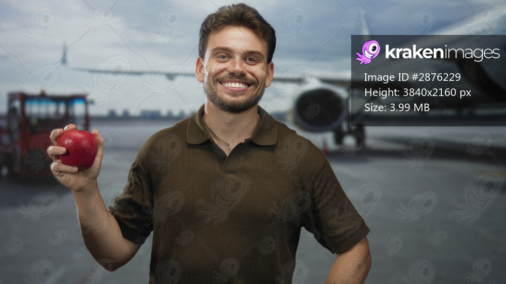 Man holding red apple at airport tarmac near jet engine and luggage tractor; contentment healthy travel snack.