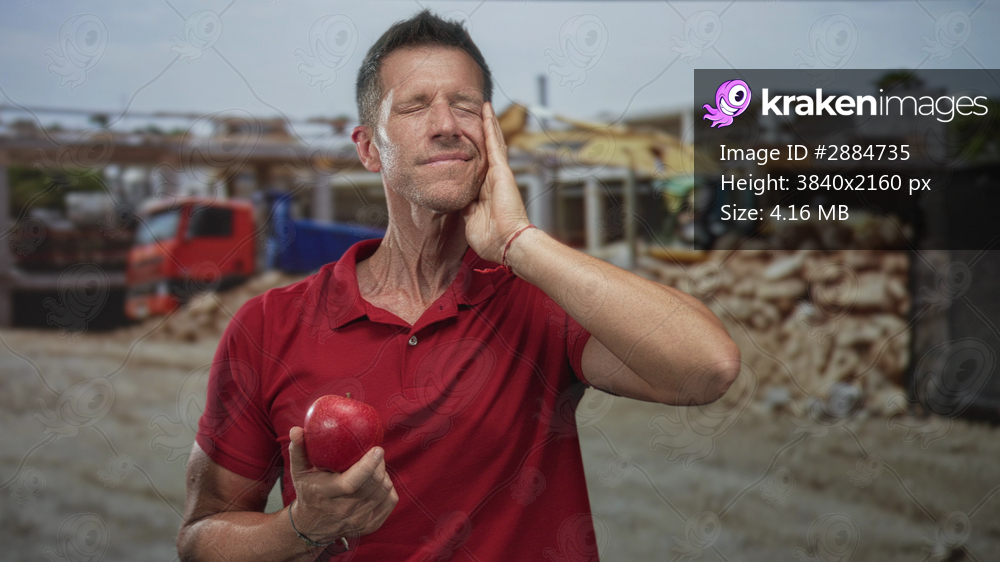 Man holding red apple, hand on cheek for toothache at construction building near excavator and truck; pain.