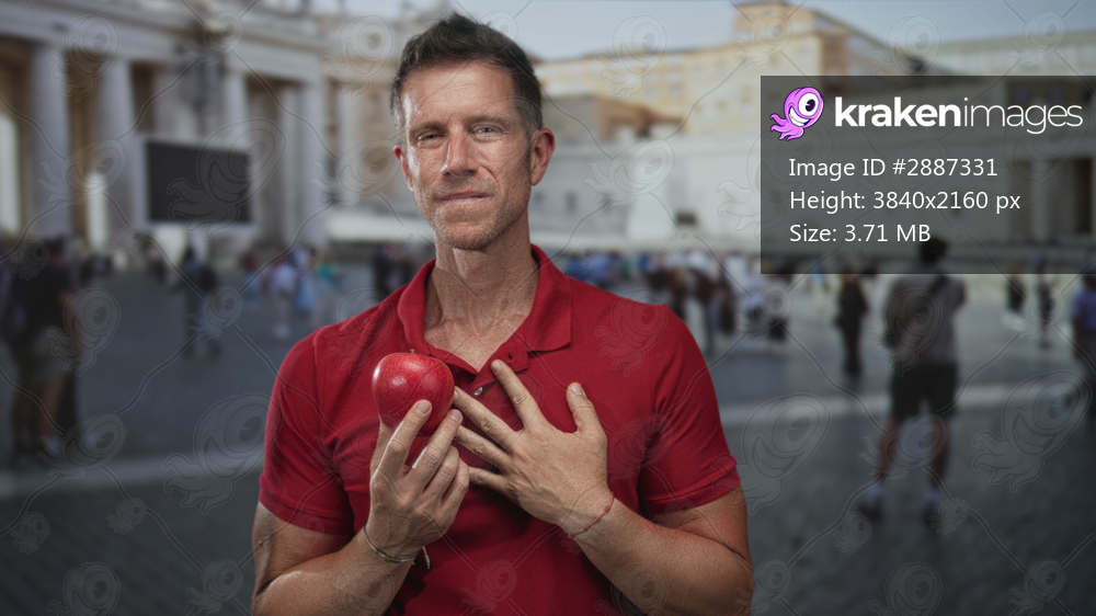 Man holding red apple, hand on chest in st peter square outside basilica among blurred tourists; quiet contemplation.