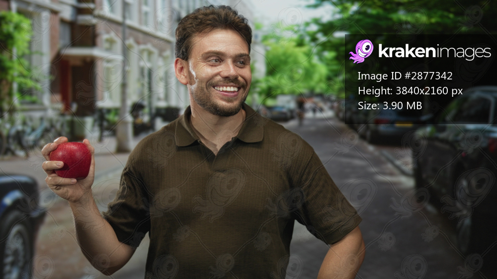 Man holding red apple in right hand smiling on street near parked cars and bicycles; healthy snack joy.
