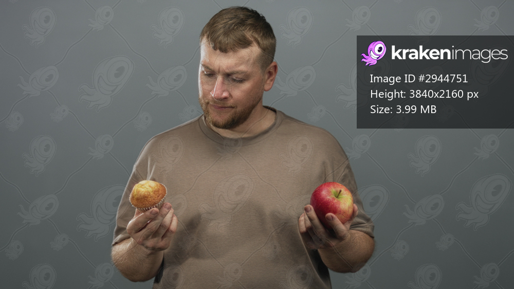 Man holding red apple and muffin with visible hands in gray studio backdrop, weighing food choice while looking down and frowning; indecision choice.
