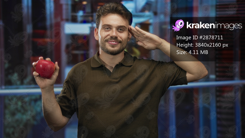 Man holding red apple salutes with right hand in hotel lobby, smiling to camera; cheerful healthy snack moment and gratitude.