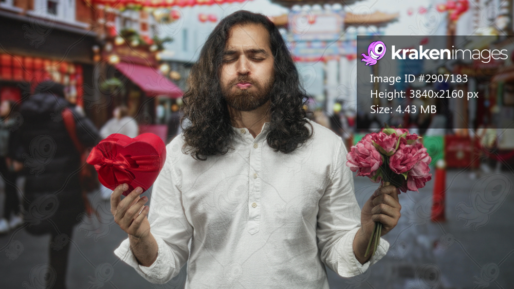 Man holding red heart box and bouquet of pink flowers on crowded street market, smiling and offering a gift; romance offering.